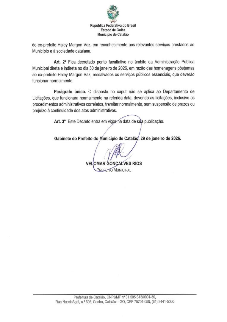 A Prefeitura de Catalão declara luto oficial por três dias em razão do falecimento do ex-prefeito Haley Margon Vaz, reconhecendo sua trajetória na vida pública e sua contribuição para o desenvolvimento político, administrativo e social da cidade. O texto do Decreto nº 1.492, de 29 de janeiro de 2026, ressalta as funções relevantes exercidas por Haley Margon Vaz, como prefeito, deputado federal e secretário de Estado, além de sua atuação em cargos estratégicos da administração pública, sempre pautada pelo interesse coletivo.